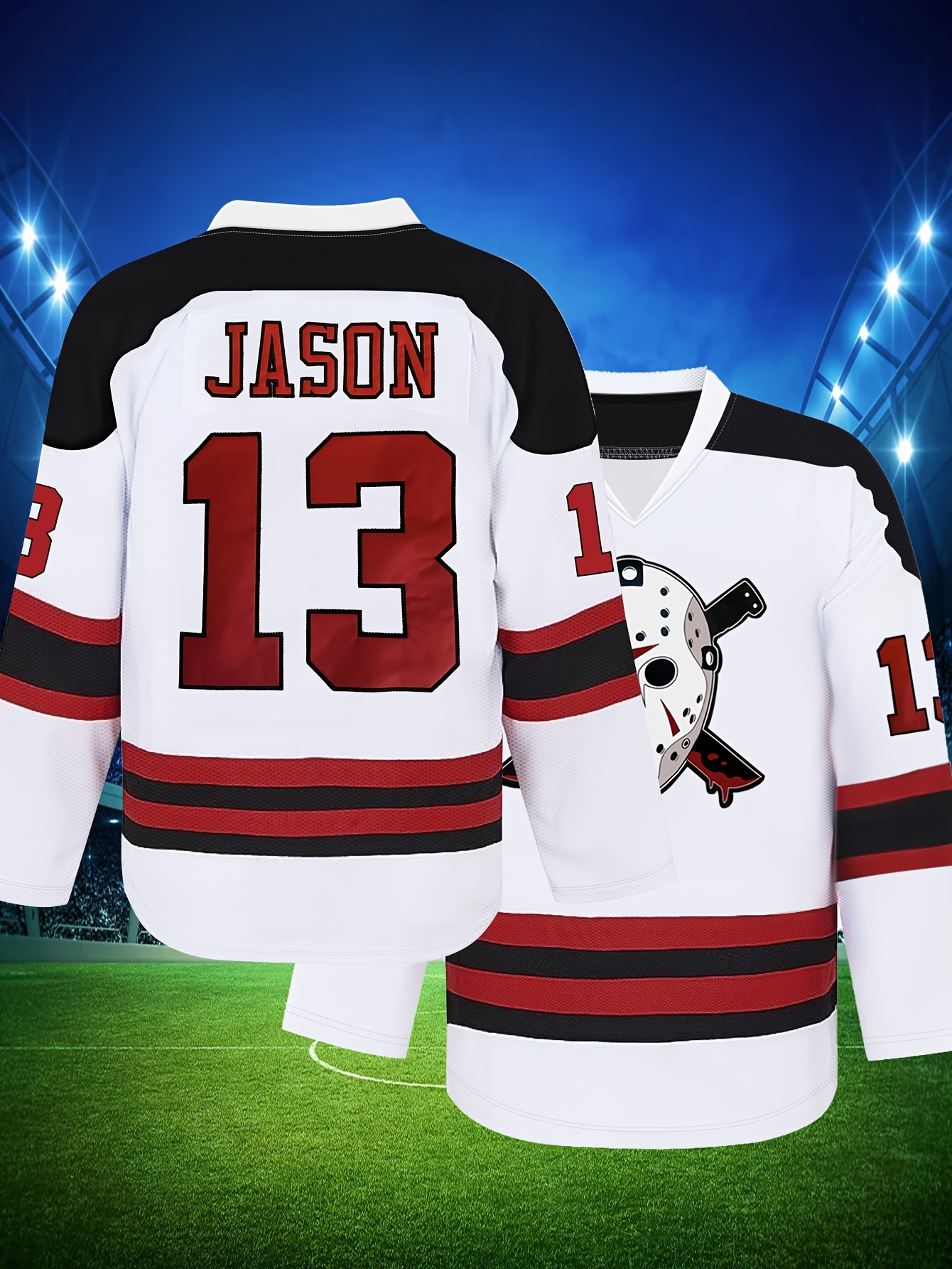 Men's #13 Jason Embroidered Ice Hockey Jersey - White & Red Striped Retro Classic V-Neck Sweatshirt, Breathable Polyester, Perfect for Sports, Casual Streetwear & Fan Events, Hockey Stocking Stuffers