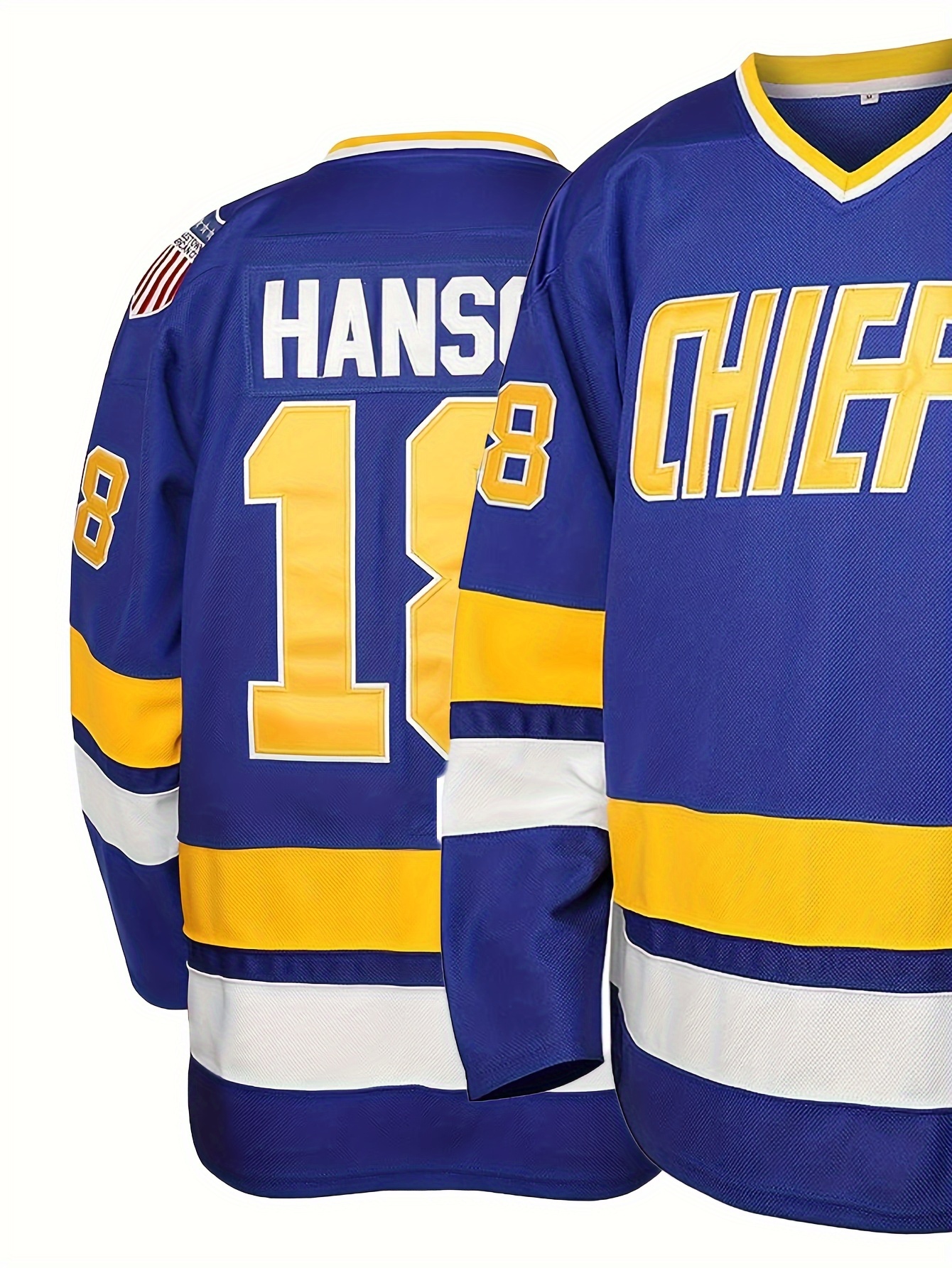 Men's #18 Blue Ice Hockey Jersey - V-Neck, Long Sleeve, Embroidered, Breathable & Stylish for Sports and Casual Wear