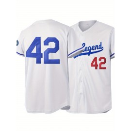 Men'S White # 42 Baseball Shirt, Classic Letter Embroidery Design, Button Style Short Sleeved Breathable Shirt, for Training And Competition Use
