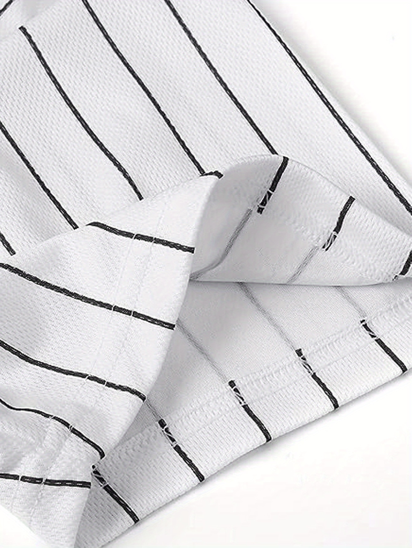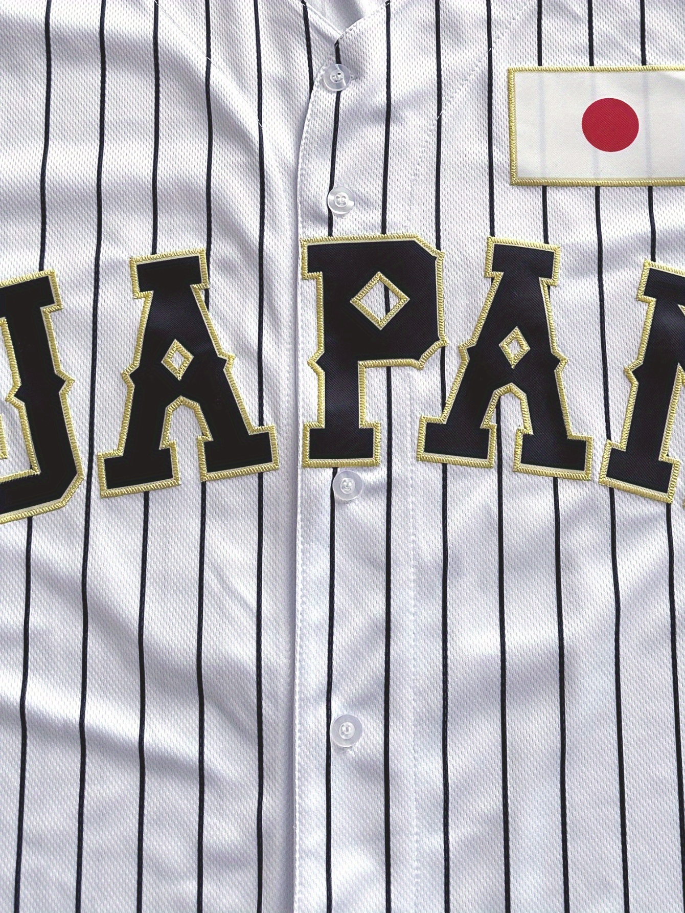 Men's White & Black Striped Baseball Shirt with Embroidered Japan Flag & Number 16 - Loose Fit Breathable V-Neck Button-Up for Sports, Casual Streetwear, All-Season Outdoor Activities